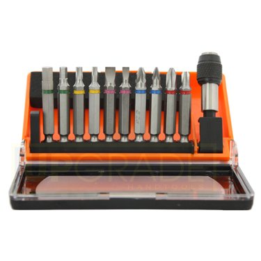 1pc Quick-release adapter. 2pc Phillips #1, #2. 2pc Pozi pz1, pz2. 2pc Blade, 4mm, 6mm. 2pc Hex, 4mm, 6mm. 2pc Torx, T15, T20