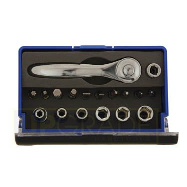 1pc Quick-release adapter. 2pc Phillips #1, #2. 2pc Pozi, pz1, pz2. 4pc flat, 4mm, 6mm 3pc Hex, 4, 5, 6mm 1pc 1/4" dr. bit socket. 6pc Sockets, 5/32", 3/16", 1/4", 9/32", 5/16", 1-1/32"